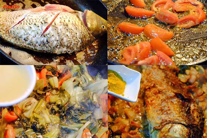 - Khi dưa mềm, đưa cá đã chiên vào nồi và om cùng. Đậy nắp và đun lửa riu riu, om trong khoảng 10-15 phút là xong.