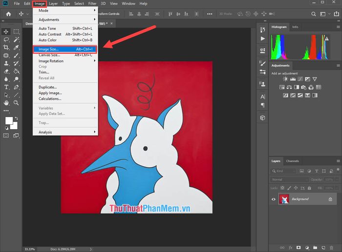 Bước 1: Mở ảnh cần làm rõ sắc nét bằng Photoshop. Chọn Ảnh -> Kích thước ảnh hoặc nhấn tổ hợp Alt + Ctrl + I.
