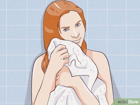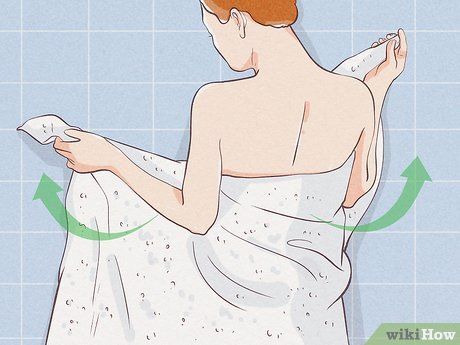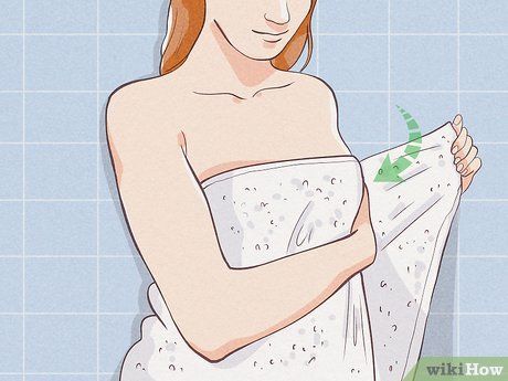 Lau khô cơ thể của bạn. Sau khi ra khỏi phòng tắm, mau khô cơ thể bằng cách lau khô bằng khăn trên các vùng ướt nhất của cơ thể bạn. Các vùng này bao gồm nhưng không giới hạn ở tóc, thân và cánh tay của bạn.