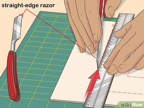 Sử dụng một dao cắt thẳng để cắt lớp dưới và tấm lót. Ấn chặt dao xuống ở góc trên của các tấm. Kéo dao một cách chậm rãi và đều đặn về phía bạn, dừng ở góc dưới. Duy trì áp lực như vậy suốt quá trình cắt của bạn và hãy rất cẩn thận để không làm lệch ra hoặc vào khỏi đường vẽ bằng bút chì.