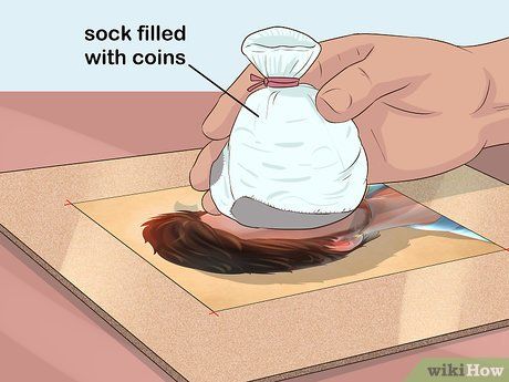 Sử dụng trọng lượng để giữ cho tác phẩm của bạn ở đúng vị trí. Bây giờ khi mọi thứ đã căn giữa, đã đến lúc bắt đầu gắn kết tất cả các phần với nhau. Sử dụng một cái gì đó nặng, như một tất đầy xu hoặc một tấm kính nặng, để giữ cho tác phẩm của bạn ở nơi bạn muốn. Đừng lo lắng quá nhiều nếu nó di chuyển, tuy nhiên, vì bạn đã đánh dấu để theo dõi sự căn giữa.