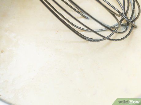 Từ từ cho thêm sữa vào hỗn hợp và tiếp tục khuấy. Dùng nĩa hoặc thìa lỗ cán dài. Đun hỗn hợp trong một vài phút, khuấy liên tục cho đến khi thấy sủi tăm (tức là độ sôi làm bong bóng xuất hiện trên mặt nhưng không vỡ ngay) và bắt đầu đặc lại. Khuấy đều các nguyên liệu vào trong hỗn hợp.