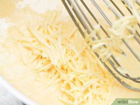 Cho thêm phô mai bào sợi, mỗi lần nửa cốc. Tiếp tục khuấy hỗn hợp cho đến khi phô mai tan chảy.