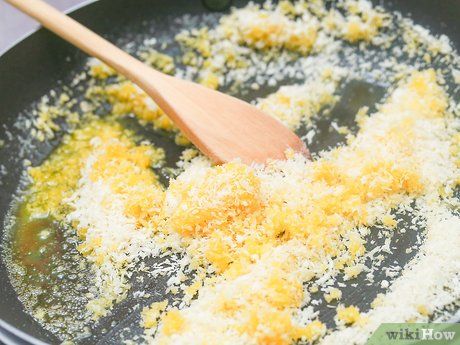 Làm Phần Phủ Trên Mặt. Đun Chảy Bơ trong Chảo để Làm Phần Phủ và Thêm Bột Chiên Xù vào. Khuấy Hỗn Hợp để Bơ và Bột Chiên Xù Quyện vào Nhau.