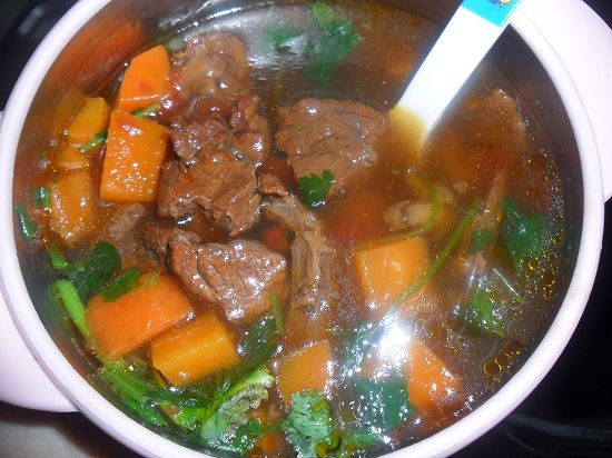 - Thêm 1 bát nước, đậy nắp lại, đun sôi và hầm với lửa lớn trong khoảng 10 phút. Sau đó, thêm khoai tây và cà rốt vào, nêm nếm vừa vị. Hầm với lửa nhỏ cho đến khi khoai tây và cà rốt mềm là được.