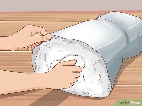Lấp đầy áo với nhồi polyester. Nếu cần, phủ lỗ cổ bằng vài dải băng dính để nhồi không bị rơi ra phía bên kia. Tiếp tục nhồi đến khi bản sao cảm thấy đầy và chắc chắn. Bạn sẽ cần khoảng hai túi nhồi polyester.