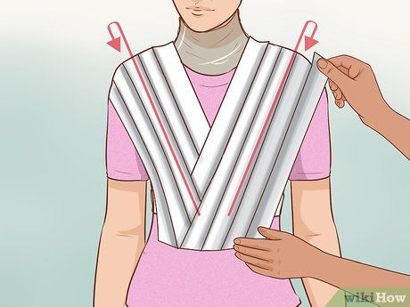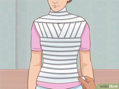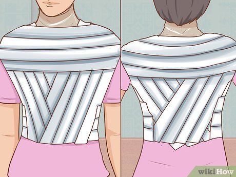 Tiếp tục thêm băng dính qua vai, ngực và phần lưng. Đặt một dải băng dính qua vai trái của bạn. Đưa một đầu xuống qua ngực trái của bạn hướng xuống dải băng dính ngang. Đưa đầu kia xuống phía sau. Tiếp tục thêm các dải băng dính cho đến khi bạn đến mép vai.