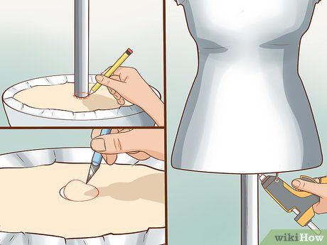 Fix the foam base onto a metal stand. Chọn một cái giá đỡ bằng kim loại chắc chắn, như một cây đèn. Vẽ đường cong của giá đỡ kim loại lên phần dưới của bản sao cơ thể. Cắt lỗ ra, sau đó đặt bản sao lên trên giá đỡ. Kín kín mọi đường viền giữa các cạnh của lỗ và giá đỡ bằng keo nóng.