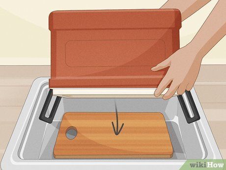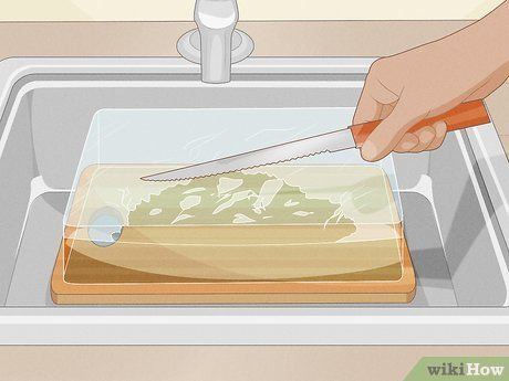 Lật thùng giữ lạnh ngược lại trên một tấm cắt trên bồn rửa. Điều này sẽ ngăn countertops của bạn bị ướt, và cũng cung cấp cho bạn một bề mặt dễ dàng để cắt đá của bạn. Nếu tấm cắt của bạn không vừa vào bồn rửa của bạn, lật thùng giữ lạnh ngược lại trong bồn rửa, nhưng hãy sẵn lòng chuyển khối đá của bạn sang một tấm cắt ở nơi khác.