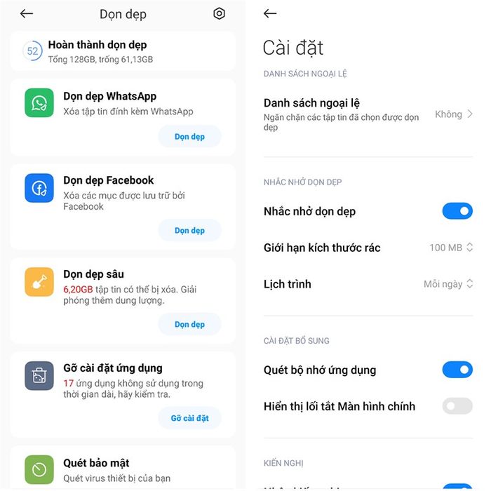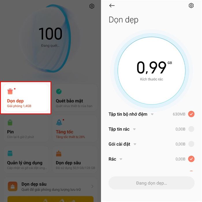 Bước 1: Bạn chỉ cần mở ứng dụng Bảo mật trên điện thoại và chọn Dọn dẹp. Đợi điện thoại quét và loại bỏ dữ liệu rác. Sau đó, bấm vào Dọn dẹp.