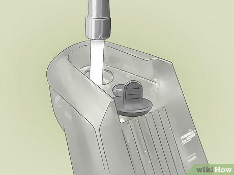 Làm trống và rửa bình chứa. Tắt nguồn và tháo phích cắm máy, cuộn dây nguồn lên một cách chắc chắn. Tháo bình chứa và đổ nước xuống bồn rửa. Rửa sạch bình chứa bằng nước nóng. Đảm bảo rửa phía dưới và xung quanh túi niêm mạc. Rửa sạch bất kỳ mảnh vụn nào từ bộ lọc màu đỏ. Rửa nửa phía trên của bình chứa qua khu vực ống phun.