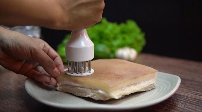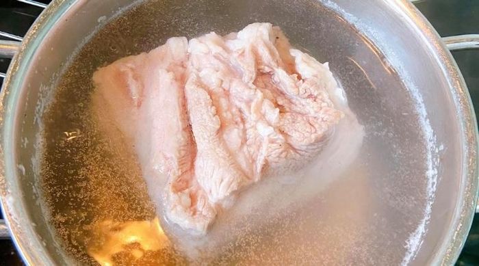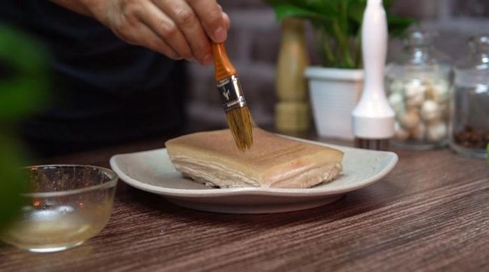 - Tiếp tục luộc thịt với nước, thêm gia vị và dấm. Khi thịt chín, vớt ra để ráo. Dùng dĩa xỉa trên bề mặt để tạo độ giòn.