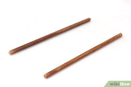 Cắt một cây gỗ thành 2 phần giống nhau. Các phần cần phải dài từ 1⁄2 đến 1 inch (1.3 đến 2.5 cm) dài hơn phần đầu hẹp của chiếc xe ngựa của bạn. Bạn có thể cắt cây gỗ bằng kéo hoặc dao làm nghệ thuật. Bạn cũng có thể gãy nó làm hai, sau đó nhám nhẹ các đầu gồ ghề.