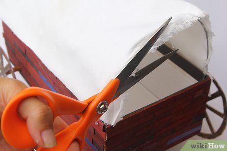Để keo khô, sau đó cắt bớt vải thừa nếu cần. Chờ vài giờ cho keo khô. Nếu có bất kỳ mảnh vải nào treo qua các bên của xe ngựa, hãy sử dụng một cặp kéo để cắt chúng cho đến khi chúng đạt tới mép trên của các bức tường bên của xe ngựa. Nếu có bất kỳ mảnh vải nào treo qua phía trước và sau của xe ngựa, hãy cắt chúng xuống.
