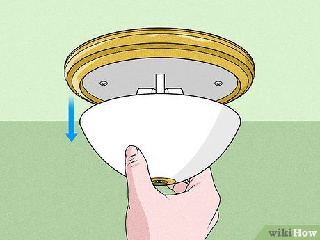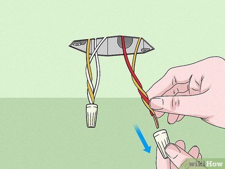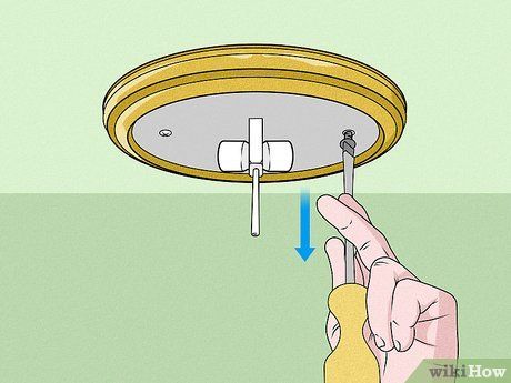 Tách đèn cũ ra. Bạn có thể cần một cây vít hoặc đai ốc để gỡ bất kỳ ốc vít hoặc ốc khóa nào đang kết nối đèn với trần. Đảm bảo bạn hoặc một người trợ giúp có cầm chắc đèn trước khi bạn tách nó ra khỏi trần. Đừng tách dây ra ngay lúc này.