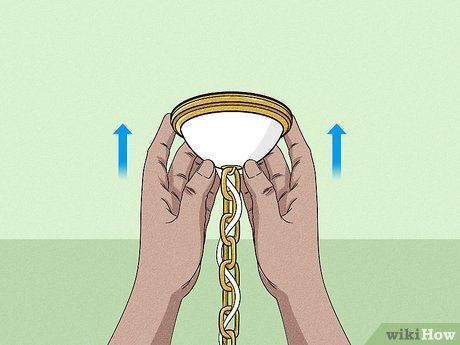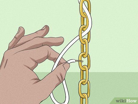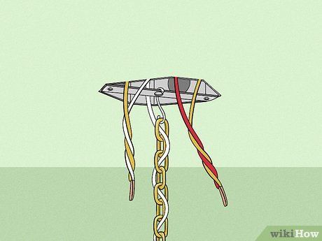 Lắp đặt đèn chùm. Để gắn từng dây, bạn sẽ cần có đèn chùm ổn định ở gần trần. Hoặc có một người trợ giúp mạnh mẽ giữ đèn chùm ở chỗ hoặc treo xích hoặc người giữ xích từ một móc mạnh treo từ thanh gắn.