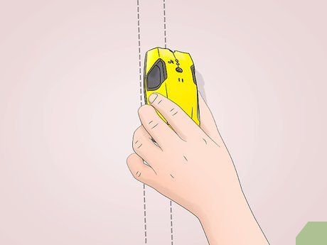 Kiểm tra tường bằng máy tìm chốt để xem có chốt nào không. Bật máy tìm chốt của bạn và giữ nó phẳng trên tường. Di chuyển máy tìm chốt từ trái sang phải qua tường của bạn cho đến khi nó kêu hoặc đèn nhấp nháy. Đánh dấu vị trí của chốt bằng bút chì trước khi di chuyển máy tìm chốt sang bên cách khoảng 16–18 inch (41–46 cm) để bạn có thể tìm một chốt khác.