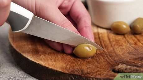 - Phương pháp này làm nát ô-liu của bạn. Nếu bạn muốn chúng trông nguyên vẹn, hãy cắt chúng bằng dao hoặc sử dụng một công cụ lấy hạt ô-liu, mà được mô tả bên dưới.