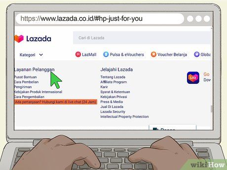 Định vị menu “Layanan Pelanggan” nếu bạn ở Indonesia. Không giống như các trang web Lazada khác, chủ yếu được viết bằng tiếng Anh, văn bản trên trang chủ Lazada Indonesia chủ yếu được viết bằng tiếng Indonesia. Để tìm tùy chọn trò chuyện trực tuyến, cuộn xuống menu có tiêu đề “Layanan Pelanggan,” có nghĩa là “Dịch Vụ Khách Hàng” trong tiếng Indonesia.