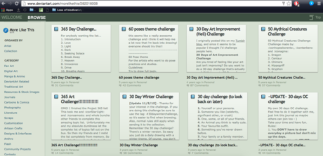 Thử thách vẽ. Điều này bao gồm các thách thức vẽ có chủ đề 365 ngày, thách thức vẽ 30 ngày, inktober, và thách thức vẽ có chủ đề 100 ngày. Bạn có thể tìm thấy chúng trên internet, pinterest, và Deviantart.
