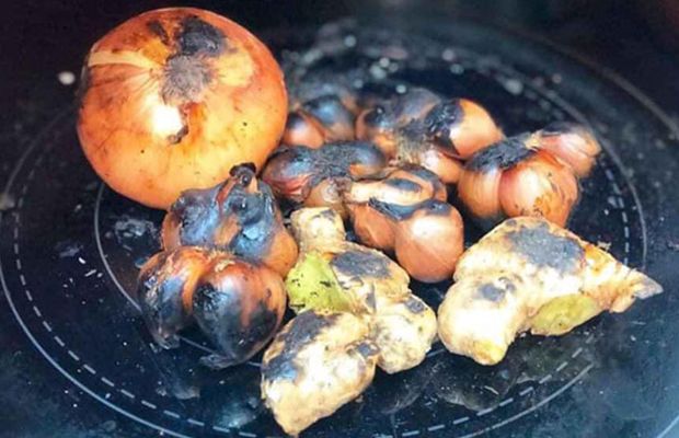 Rửa sạch 1 củ gừng, 2 củ hành tím, 1 củ hành tây và để ráo. Sau đó, gói chúng bằng giấy nhôm và đặt lên bếp để nướng trong 15 phút.
