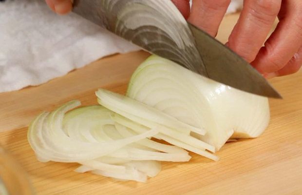 Cắt lát mỏng 1 củ hành tây, sau đó ngâm trong nước đá.