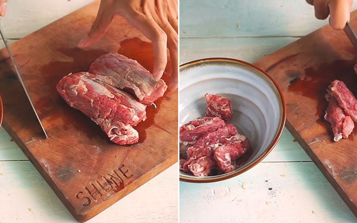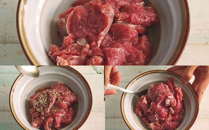 - Thịt bò rửa sạch với nước, cắt thành miếng vuông cỡ 3x3cm