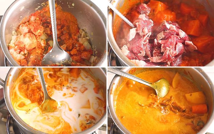 - Đổ nước cốt dừa và thêm một lượng nước lọc để nấu gần ngập mặt thịt. Tiếp theo, thêm khoai tây, cà rốt vào nấu chung và đun ở lửa lớn. Đợi nồi cà ri sôi bùng, giảm lửa và ninh khoảng 30 phút cho đến khi tất cả nguyên liệu mềm nhừ.