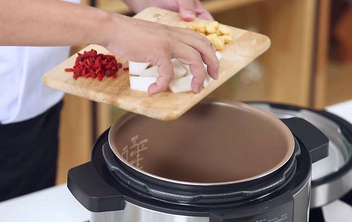 Trong cách hầm xương heo sử dụng nồi áp suất, bạn chỉ cần đổ nước vừa đủ để ngập xương. Việc này giúp giảm mức bay hơi so với cách hầm truyền thống.