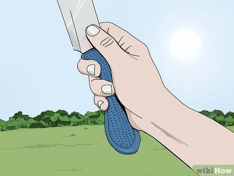 Cầm con dao bằng cách cầm ngón cái. Giả sử cách cầm ngón cái. Điều này sẽ là cách hiệu quả nhất để làm giảm quay của con dao trong quá trình bay. Ép chặt phần cán của con dao chặt chẽ giữa ngón cái và ngón giữa của bạn, nhưng đừng nắm chặt quá. Trong quá trình ném, cổ tay và cánh tay của bạn nên di chuyển như một.