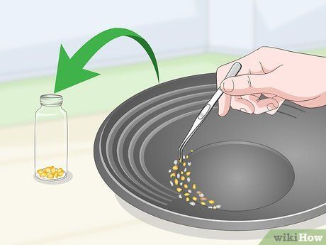 Lấy các mảnh vàng bằng kẹp nhọn vào lọ thủy tinh. Sau khi dành thời gian lọc các bột, bạn có thể bắt đầu nhìn thấy các hạt và bọt vàng ở dưới đáy chảo của bạn. Lấy các mảnh này bằng kẹp nhọn và đặt chúng vào lọ thủy tinh để mang đến một người kiểm định để xác định giá trị của chúng.