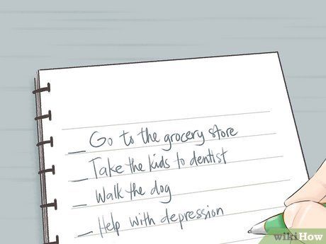 Kết hợp mỗi người với một nhu cầu cụ thể. Bây giờ là lúc để so sánh danh sách của bạn. Chọn người nào để yêu cầu giúp đỡ cho mỗi nhiệm vụ. Có lẽ chị gái của bạn là một nhà tâm lý học. Hỏi cô ấy về một số ý tưởng về cách vượt qua trầm cảm. Nếu con cái bạn đã đủ lớn, họ có thể dắt chó đi dạo. Yêu cầu bạn đồng hành nghỉ làm một chút để đảm bảo rằng trẻ con được đưa đến nha sĩ. Hỏi hàng xóm nếu họ có muốn mua một vài thứ ở cửa hàng tạp hóa lần tới họ ra chợ. Chọn người dựa trên khả năng và mối quan hệ của họ với bạn.