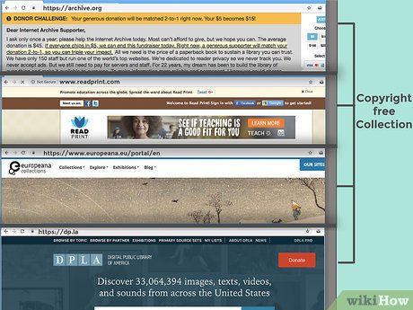 Tìm trong các bộ sưu tập không bản quyền. Phổ biến nhất trong số này là Project Gutenberg, với bộ sưu tập khổng lồ của các tác phẩm công cộng. Internet Archive, ReadPrint.com, Europeana, và Digital Public Library of America là các dự án tương tự.