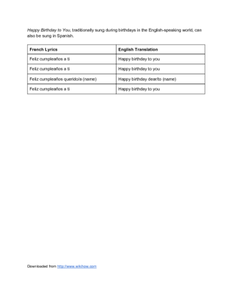 Mẹo: Những bài hát sinh nhật có thể trở nên phức tạp trong văn hóa tiếng Tây Ban Nha. Nhiều quốc gia ở Latin Mỹ như Colombia, Venezuela và Chile có phiên bản riêng của bài hát sinh nhật truyền thống, một số trong số đó có nhiều câu và có thể khá dài.