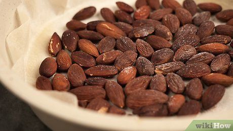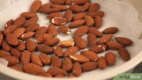 Tiền nướng lò của bạn lên 350 °F (177 °C). Trong khi lò của bạn đang được tiền nướng, phân bố 2 chén hạt hạnh nhân trên một tấm kê. Đặt một tấm giấy nướng vuông lên kê trước khi bạn thêm hạt hạnh nhân vào để làm sạch kê sau khi nướng dễ dàng hơn.