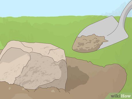 Lột đi đất xung quanh tảng đá. Với một tảng đá bị lồi lõm trong đất, quan trọng là bạn phải có một ý tưởng tốt về việc tảng đá lớn hay nhỏ ra sao. Sử dụng một cái xẻng, đào bỏ tất cả đất xung quanh tảng đá để tiết lộ hình dáng và kích thước tổng quan của nó.