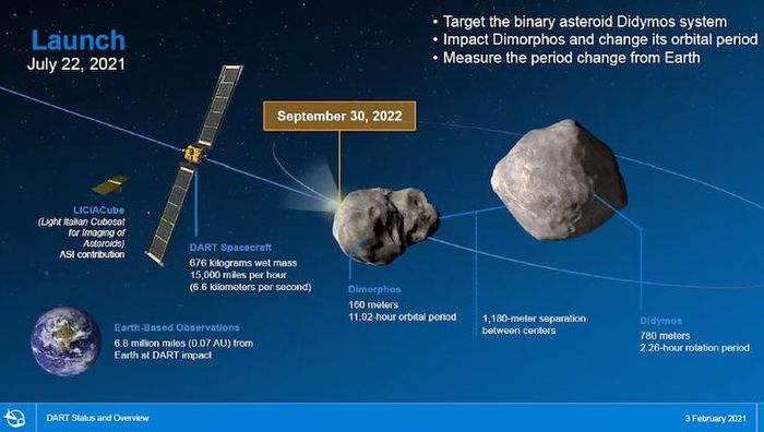 The DART mission dates and timeline events. Image via Johns Hopkins UniversityVì vậy, chúng ta sẽ có thể phát hiện sự thay đổi 1% từ Trái Đất, trong khi cặp đôi này sẽ tiếp tục quỹ đạo xoay quanh Mặt Trời. DART cũng sẽ triển khai một vệ tinh nhỏ mười ngày trước khi va chạm để ghi lại mọi thứ.