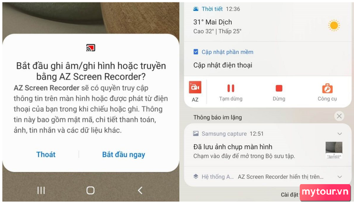 Bước 3: Nhấn vào biểu tượng máy quay. Lúc này, bạn sẽ nhận được thông báo về việc ứng dụng sẽ bắt đầu quay màn hình. Hãy chọn Bắt đầu ngay. Khi muốn kết thúc quá trình ghi hình, hãy vuốt màn hình từ trên xuống dưới và chọn Dừng.