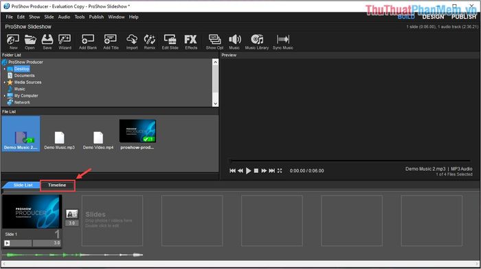 Bước 3: Trong Proshow Producer, khi chỉ có một khu vực Soundtracks, để chèn bài thứ hai, chúng ta chuyển sang Timeline.