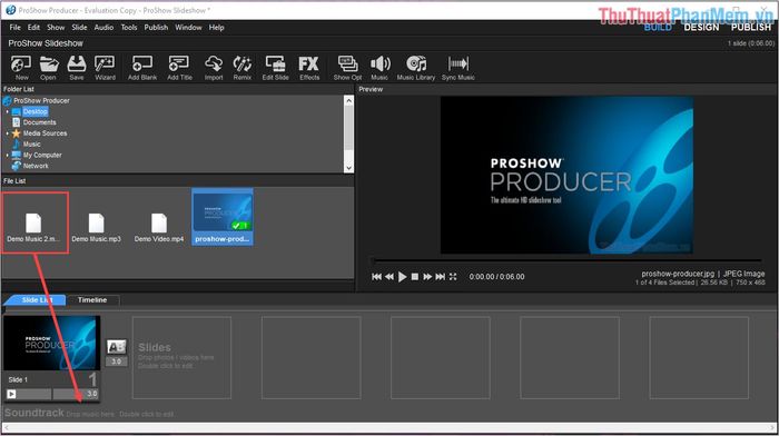 Bước 2: Sau khi bổ sung hình ảnh, video vào Slide List, bạn chỉ cần kéo file nhạc xuống phần Soundtracks.