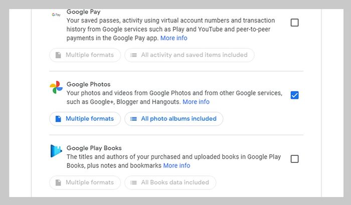 Để truy cập vào các tệp của bạn, hãy vào trang Tài khoản Google của bạn trên web. Khi bạn đã đăng nhập, nhấp vào Dữ liệu và cá nhân hóa, sau đó chọn Tải dữ liệu của bạn. Bạn sẽ thấy tất cả các ứng dụng và dịch vụ Google khác nhau được liệt kê, vì vậy chỉ cần đánh dấu tùy chọn Google Photos, và sử dụng nút Tất cả album ảnh được bao gồm nếu bạn chỉ muốn tải xuống một số album cụ thể.