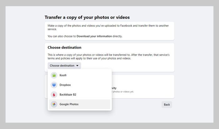 Quay lại trang Cài đặt, bạn cũng có thể nhấp vào Thông tin Facebook của bạn và sau đó nhấp vào Xem bên cạnh Chuyển một bản sao của ảnh và video của bạn: Màn hình tiếp theo cho phép bạn chuyển tệp của mình trực tiếp đến một dịch vụ đám mây khác, mà không cần tải xuống gì cả. Dropbox và Google Photos là hai trong số các dịch vụ được hỗ trợ.
