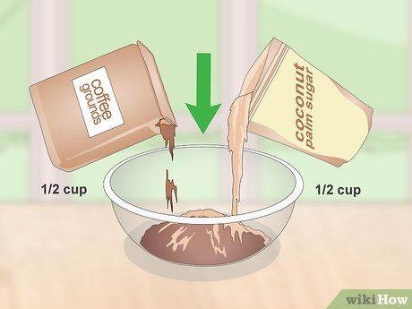 Kết hợp bã cà phê với đường cọ dừa. Đổ 1/2 tách (56 g) bã cà phê vào một tô, sau đó thêm 1/2 tách (115 g) đường cọ dừa. Khuấy chúng với một thìa hoặc cái dĩa.