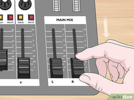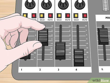 Vặn nhỏ giọng và thanh trượt kênh xuống hoàn toàn. Tìm kiếm điều khiển âm lượng chính ở phía dưới bên phải của bộ trộn, thường được ghi là 'Main Mix' hoặc tương tự. Các thanh trượt là nút hoặc thanh trượt điều khiển âm lượng của từng nguồn đầu vào cá thể được tìm thấy dọc theo đáy của bộ trộn và có thể là nút hoặc thanh trượt. Nếu các điều khiển là nút, hãy vặn chúng theo chiều kim đồng hồ cho đến khi chúng không còn quay nữa. Nếu các điều khiển là thanh trượt, kéo chúng xuống càng thấp càng tốt để giảm âm lượng.
