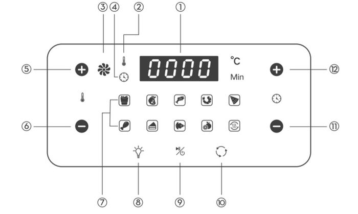 7: Các chỉ báo chế độ đa dạng: Khoai tây chiên - Quay - Cá - Tôm - Pizza - Gà - Bánh nướng - Quay nướng - Sấy khô - Hâm nóng.