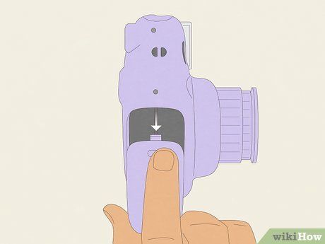 Mở nắp pin. Khi nhìn vào mặt trước của máy ảnh, đây là bảng điều khiển ở bên trái. Nhấn ngón cái vào rãnh nhỏ và đẩy nó mở ra.