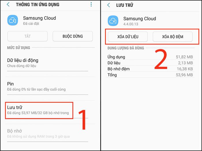 Vào Cài đặt > Chọn Ứng dụng > Vào Samsung Cloud > Nhấn vào Lưu trữ > Chọn XÓA CACHE sau đó XÓA DỮ LIỆU.