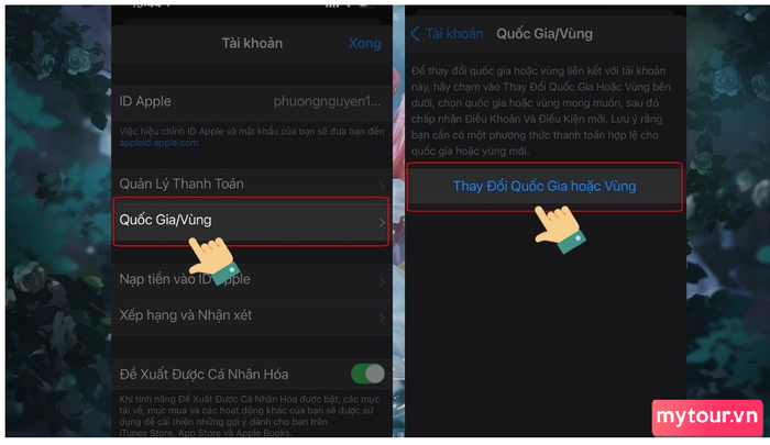 Bước 2: Click vào mục 'Thay Đổi Quốc Gia hoặc Vùng' để tiếp tục quá trình thay đổi.