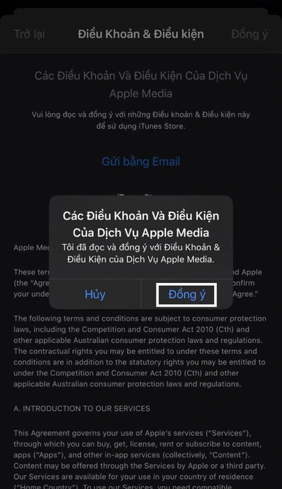 Bước 5: Chọn Đồng ý khi xuất hiện thông báo Các điều khoản và điều kiện của dịch vụ Apple Media.