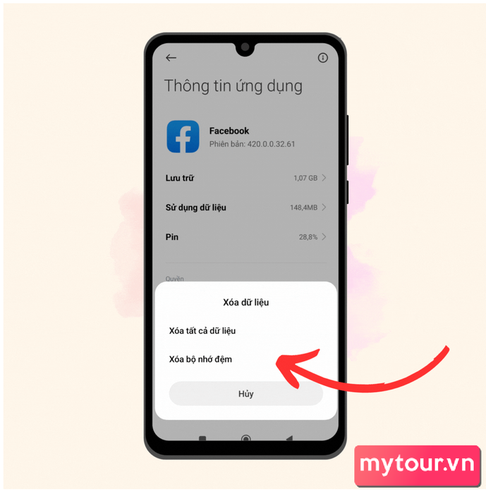 Chọn ứng dụng cần dọn dẹp.- Sau đó, nhấn Xóa tất cả dữ liệu > Click vào Xóa bộ nhớ đệm.